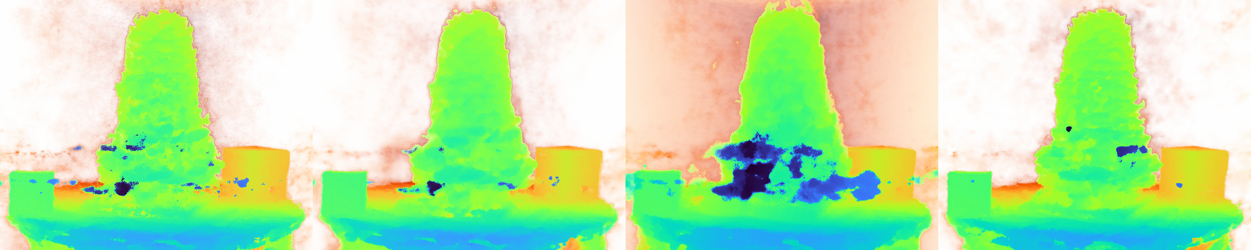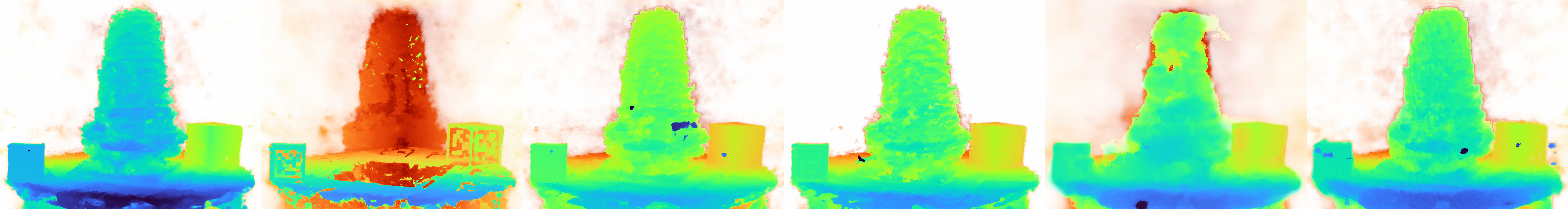 Using our method on pseudo-rgb data (Ours-RGB and Ours-Cont), we don't see much performance difference to the nerfacto baseline despite the more challenging representation.
