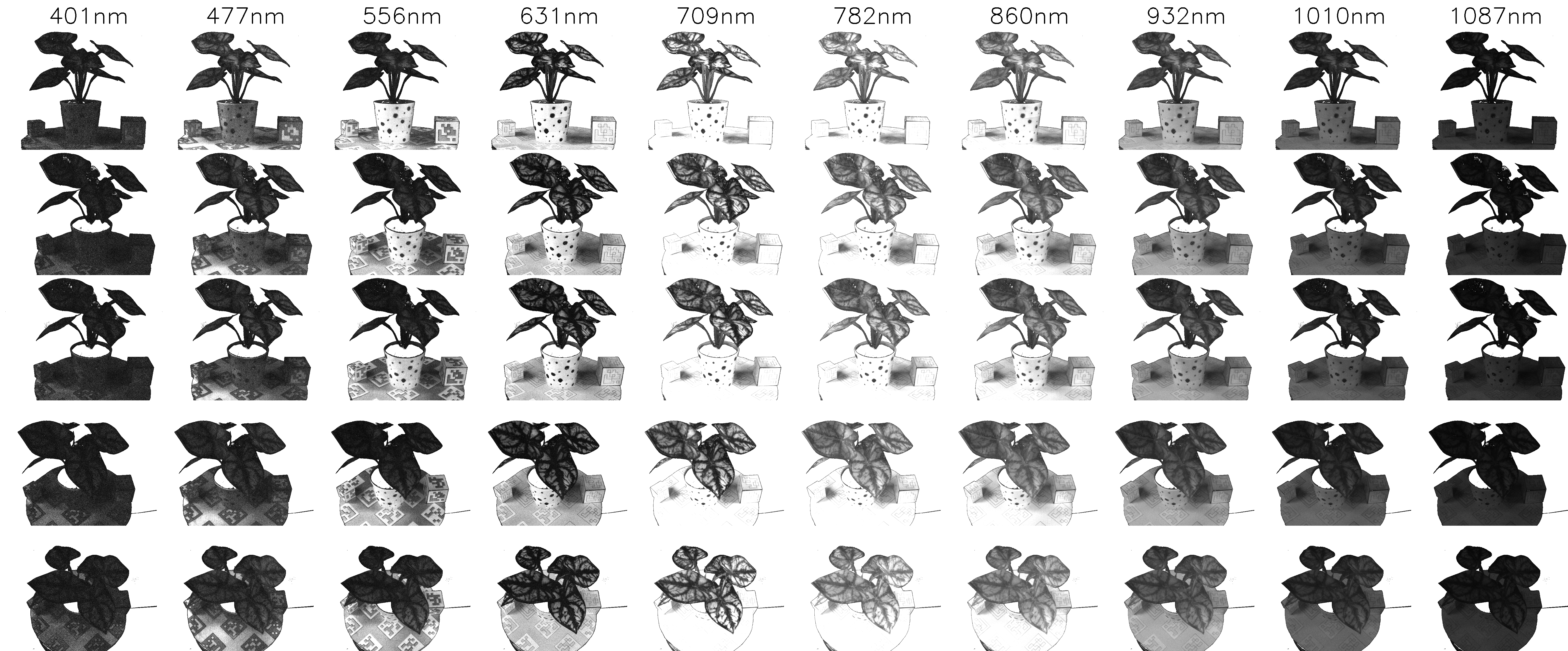 We can observe that the right-most column (trained using all 128 hyperspectral channels) produces better color accuracy and clarity than the middle-3 columns (trained using only pseudo-RGB images).